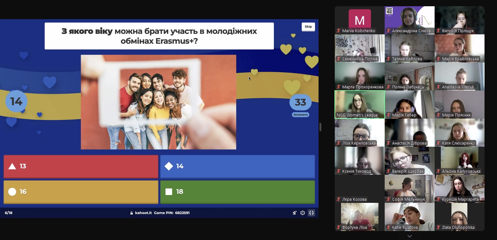 На завершення зустрічі Наталя Баліцька, фасилітаторка менторської програми ініціативи “Посли європейської молоді” в Україні, посолка європейської молоді в Україні, а також проєктна менеджерка ГО “Жіноча Ліга” і менеджерка проєкту “Girls Empowerment Academy 1.0 / Академія розширення можливостей для дівчат 1.0”, провела інтерактивний Kahoot-квіз для закріплення знань учасниць про можливості від ЄС для молоді, в рамках якого 3 переможниці отримали фірмовий мерч за найкращі результати.