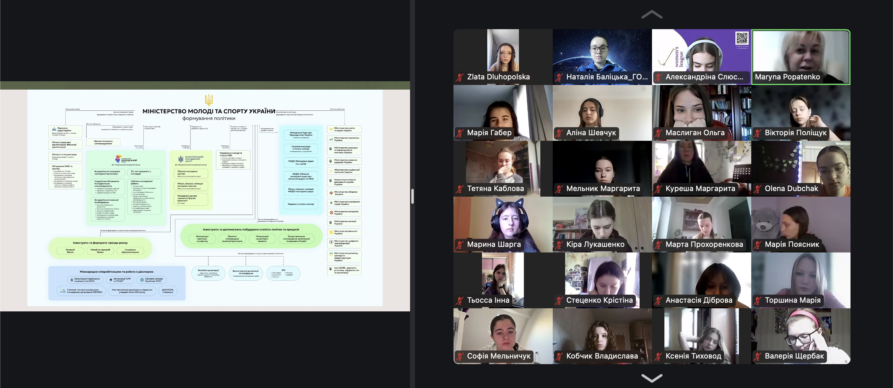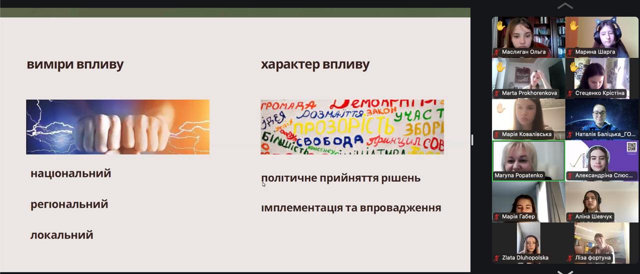 Поміж іншого, пані Марина розповіла, як формується молодіжна політика в Україні та хто є її спражніми архітекторами/ками, а також розповіла, як приймаються рішення у сфері молодіжної політики та якими бувають форми впливу на молодіжну політику на локальному і національному рівнях. До прикладу, Міністерство молоді та спорту України відповідає за формування та реалізацію державної політики у сферах молодіжної політики, фізичної культури і спорту, а також утвердження української національної та громадянської ідентичності.