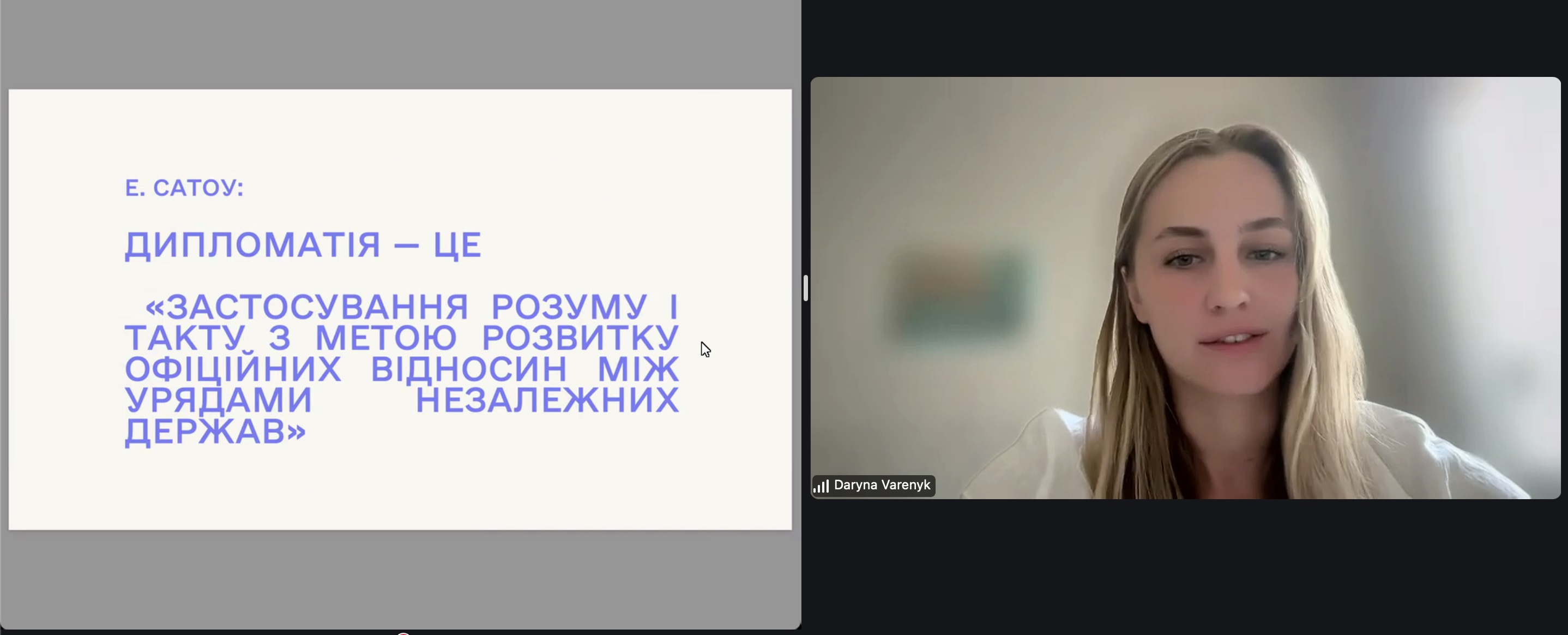 Під час першої частини зустрічі, яка була присвячена основам молодіжної дипломатії, учасниці взяли участь у міні-воркшопі, який провела Дарина Вареник, аналітикиня у Міністерстві цифрової трансформації України, радниця з міжнародних питань у проєкті “ArmWomenNow” та авторка одного з кращих кейсів молодіжної дипломатії в межах “Young Diplomat Award 2023” від Фонду родини Богдана Гаврилишина.